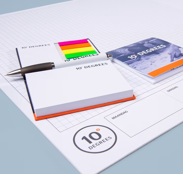 Laat jouw merk letterlijk blijven plakken met bedrukte memoblokjes. Handig voor snelle notities, herinneringen of korte boodschappen. Perfect voor op kantoor, onderweg of als originele weggever. Bij ons stel je ze helemaal naar wens samen: van standaard memoblokken tot luxe varianten met een zachte of harde cover. Onze memoblokjes zijn voorzien van een handige plakrand, zodat jouw boodschap overal blijft hangen. Laat elk velletje bedrukken met jouw logo of ontwerp, in PMS of full color. Kies uit wit, gerecycled of kraftpapier. Zo wordt zelfs een simpele notitie een effectieve merkboodschap.