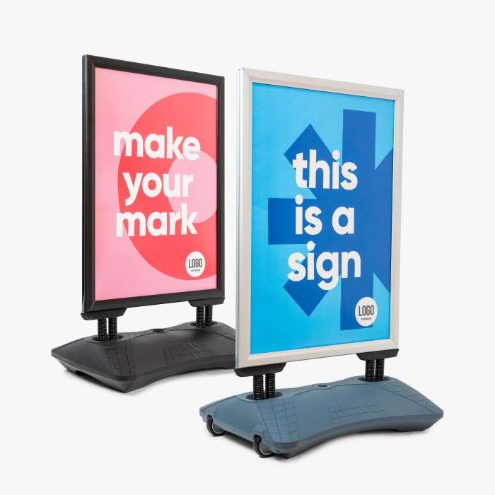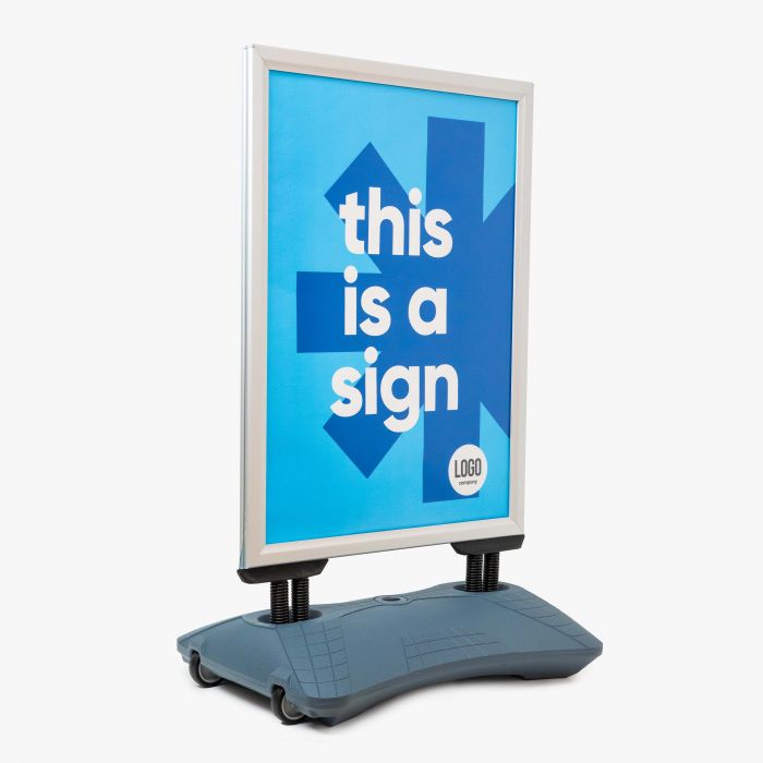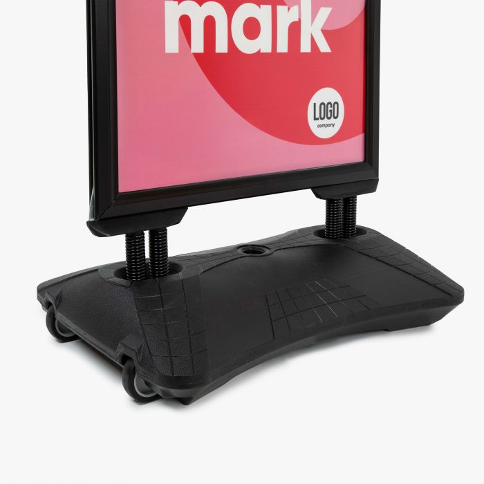 Het Premium stoepbord met watertank is de ideale oplossing wanneer je een hoogwaardige, weer- en windbestendige manier zoekt om je boodschap opvallend te presenteren buiten. Dankzij de verzwaarde voet staat het bord stabiel, zelfs bij harde wind. Het bord is uitgevoerd met dubbelzijdige kliklijsten, waardoor je aan beide zijden posters kunt tonen. Posters in formaat A1 (en afhankelijk van uitvoering ook A0) kunnen snel verwisseld worden, zodat je acties of promoties eenvoudig kunt aanpassen. De voet is voorzien van wielen en handgreep, zodat je het bord makkelijk kunt verplaatsen.